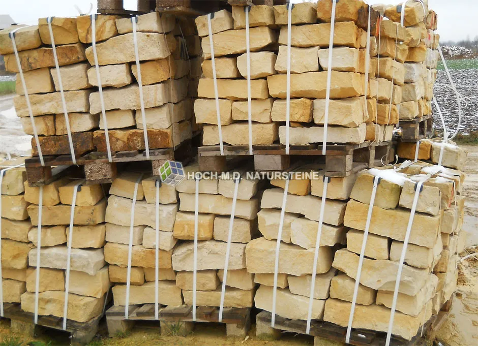 - Verpackung: Anlieferung der Sandsteinmauersteine auf Paletten