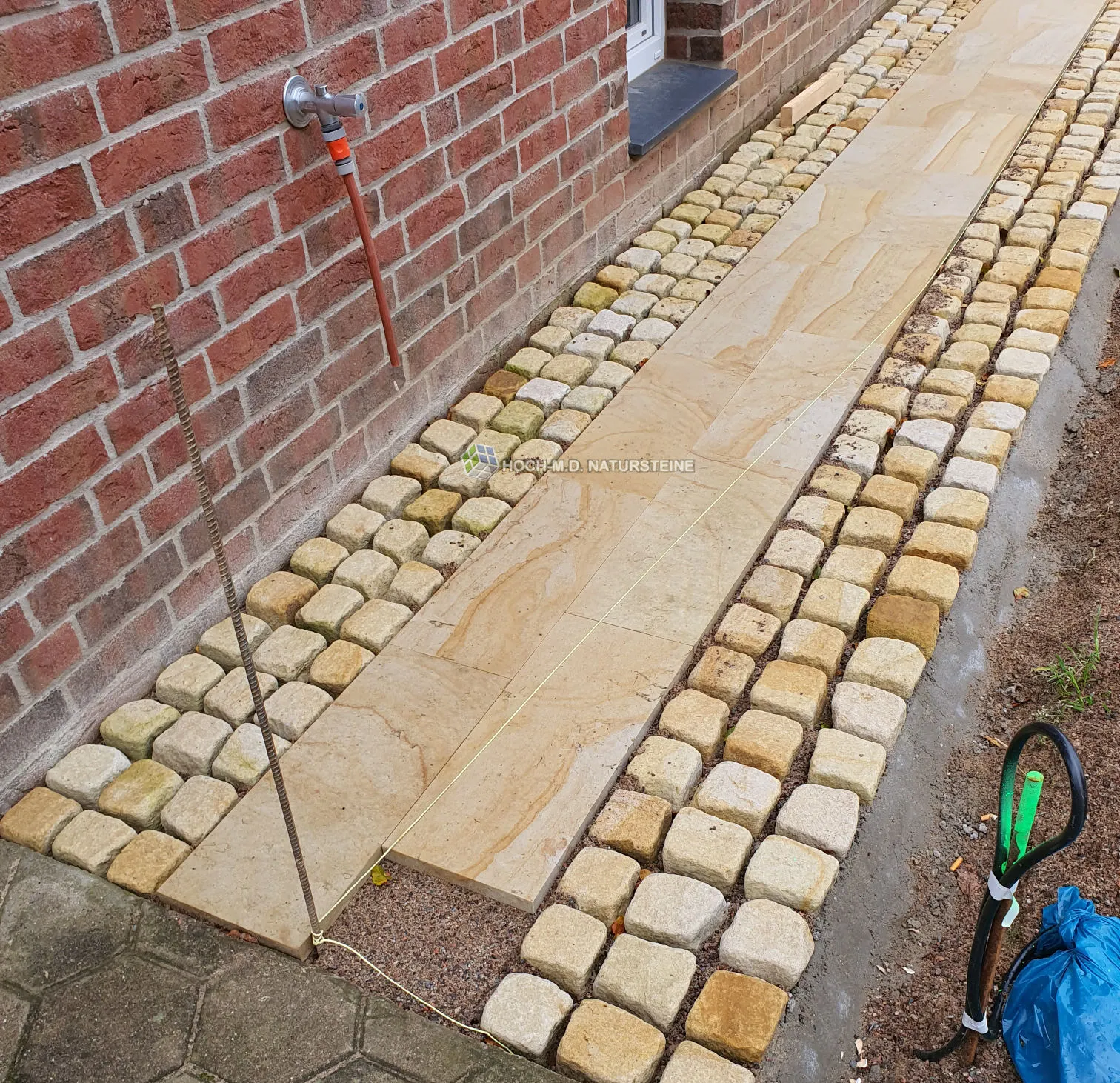 Weiche Materialien bzw. Sandsteine sind für eine Außenanlage nicht geeignet. Sie können sich mit der Zeit sogar durch das Regenwasser verflüssigen. Dies liegt an der schlechten Quarzit-Bindung, wodurch die Steine keine ausreichende Härte besitzen. Schlechte Materialien bröckeln im Laufe der Jahre ab, bilden Schuppen bzw. blättern ab, verschimmeln und verändern ihre Farben. Wir haben unsere Erfahrungen mit Sandsteinen minderwertiger Qualität schon gemacht ... Nur echte Hartsandsteine (quarzitisch gebundene Sandsteine) wie Flavus lassen sich polieren.
