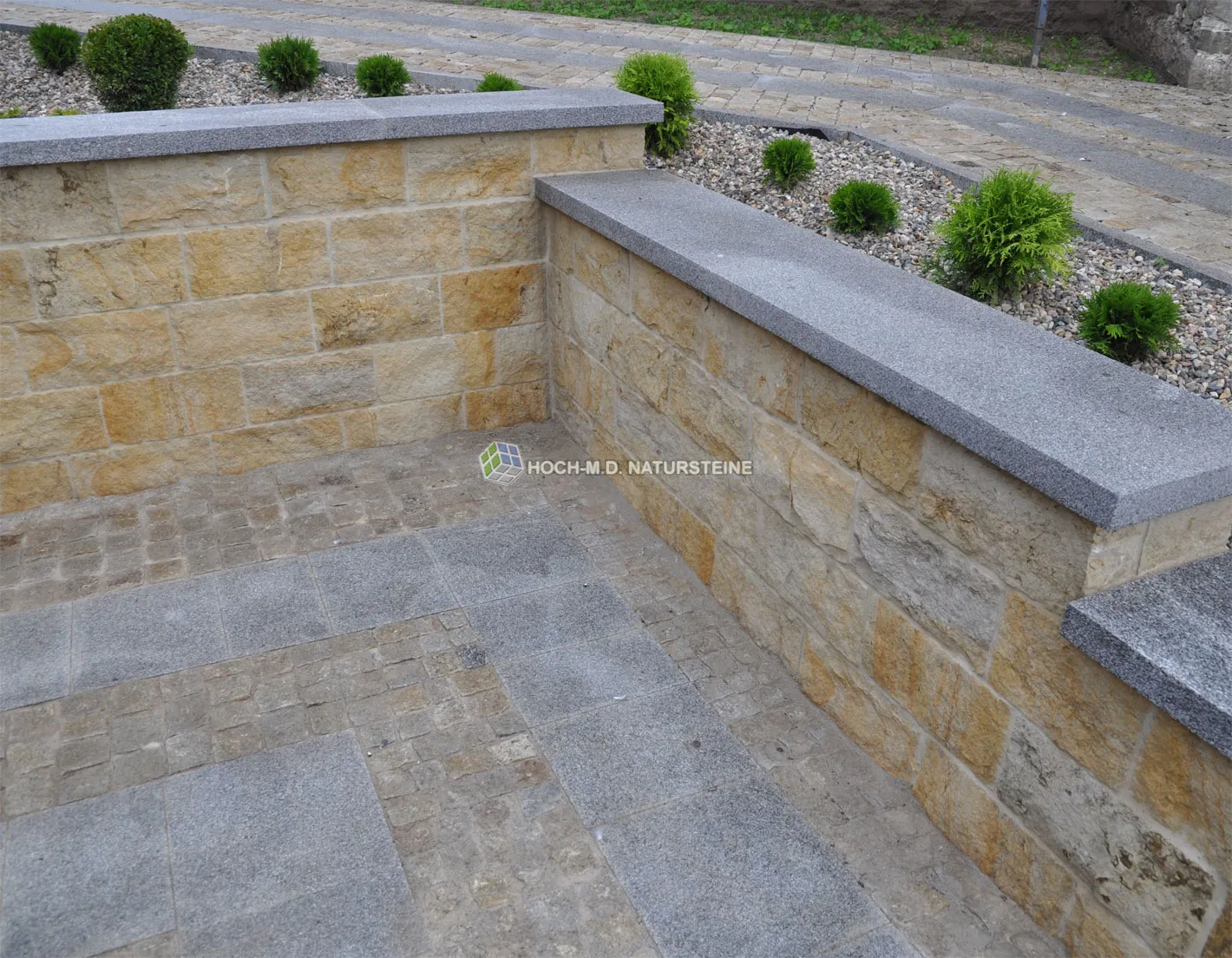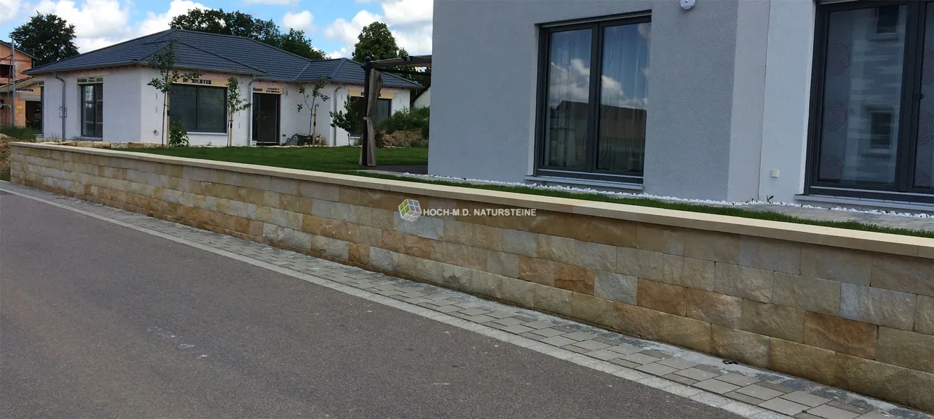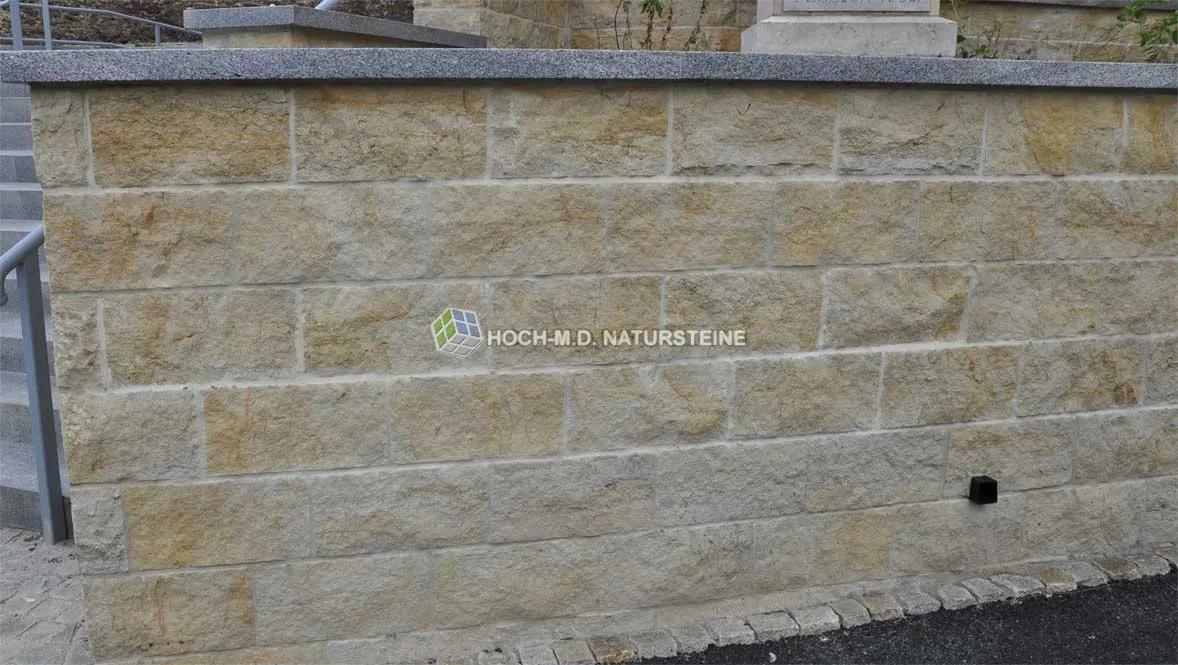 Besonders Sandsteinmauersteine Flavus sind sehr robust bzw. hart, 100% frost-, verwitterungsbeständig und aufgrund der ausgezeichneten Widerstandsfähigkeit auch durch hohe Gewichte belastbar.